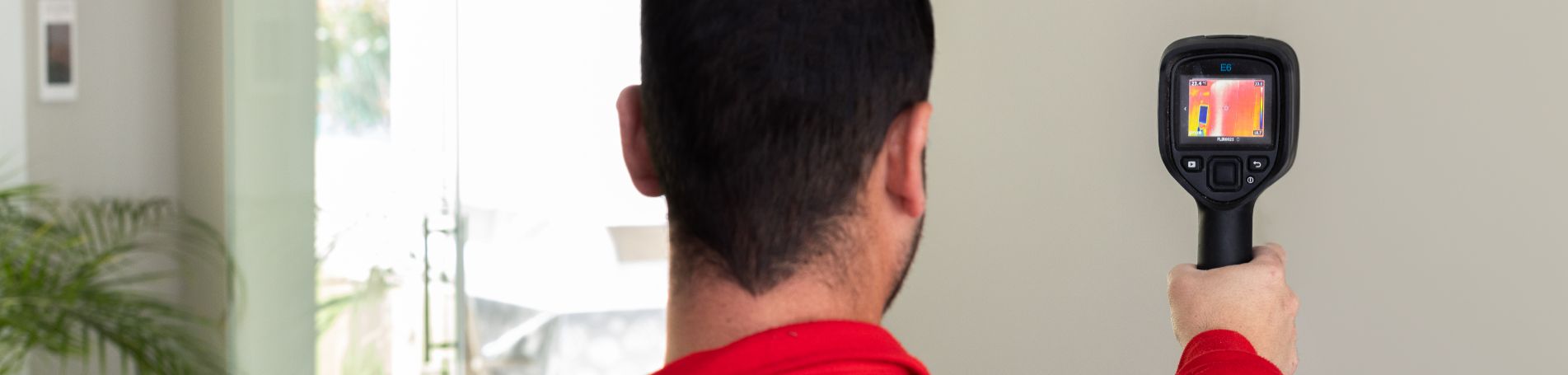 La cámara termográfica detecta y mide el nivel de energía o calor de un elemento y lo convierte en una imagen. Con este método conseguimos detectar el posicionamiento de las tuberías al discurrir agua por ellas, viendo así si existe alguna anomalía.